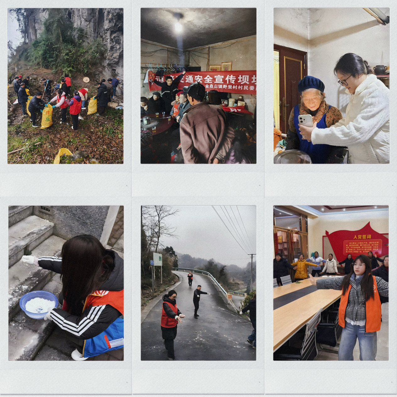 2025级社会工作班苟灿灿同学走进遵义市红花岗区金鼎山镇野里村村委会,开展为期一个月的实践服务。她不惧山路崎岖、洞穴湿冷,参与洞穴垃圾清理守护家乡生态;耐心为老年群众讲解操作流程,还为行动不便老人上门完成养老认证;凝冻天气里坚守一线,撒盐除冰、清理路障保障村民出行安全;同时化身政策宣传员,用通俗语言开展兵役登记、医保政策解读,协助召开村民坝坝会,倾听群众诉求、记录民生难题,在生态守护、民生服务、应急保障的点滴行动中,读懂了基层工作的烦琐与温度。