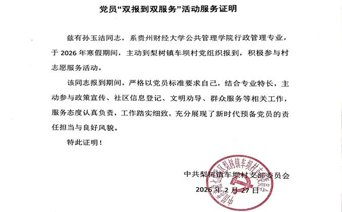 此次寒假“双报到”社会实践活动,党员们以所学服务基层群众,在服务奉献中擦亮了青春底色,在知行合一中强化了责任担当。支部将以此次活动为契机,持续深化党员教育管理,引导广大学生党员积极投身志愿服务与基层治理工作,充分发挥专业特长,用实际行动践行初心使命,让青春在为群众办实事、办好事的实践中绽放光彩。