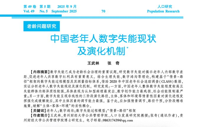 本网讯:(张奇 图文报道)日前,鸿运娱乐城 副院长(主持工作)王武林及博士研究生张奇发表的学术论文《中国老年人数字失能现状及演化机制》,刊发于《人口研究》2025年第5期。《人口研究》创刊于1977年6月,是人口学专业唯一被国家新闻出版署选定的国家期刊方阵(双效)期刊、国家社科基金首批资助期刊、中国人口学会会刊、CSSCI来源期刊、全国中文核心期刊、中国科技核心期刊、AMI权威期刊、中国最具国际影响力学术期刊,在国内外具有广泛的影响。