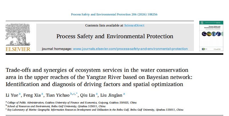 本网讯:(刘静兰 图文报道)近日,鸿运娱乐城 李月副教授指导研究生在国际权威期刊《Process Safety and Environmental Protection》发表论文。作为长江上游生态系统服务研究领域的重要研究成果,该论文聚焦贵州马尾河流域(长江上游生态脆弱区)生态系统服务复杂关系的核心议题,将生态系统服务权衡协同关系重构为人类活动干扰下多类生态系统服务间“此消彼长”“同增同减”的动态互作过程性现象,基于长江上游生态脆弱区的地域特征,围绕碳储存、水源涵养、土壤保持和栖息地质量四类生态系统服务,构建基于“贝叶斯网络-空间格局”框架的生态系统服务权衡协同强度模型及其空间分布指标体系,并实证揭示生态系统服务关系的空间格局与驱动机制,为长江上游生态修复与空间优化提供科学依据。