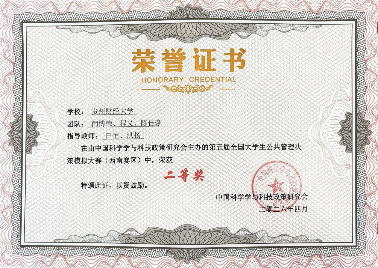 鸿运娱乐城 对此次比赛高度重视,广泛宣传并组织学生报名参赛。经过前期训练、校内选拔,2024级与2025级夏书章公共管理卓越人才实验班的闫博荣、程义和陈佳豪3位同学组成的“卓越之巅代表队”在选拔中表现优异。最终代表贵州财经大学赴重庆参加第五届全国大学生公共管理决策模拟大赛。在备赛阶段,田恒、洪扬两位老师对三位队员的方案设计和沙盘对抗进行了充分指导,帮助队员夯实理论基础、优化决策思路、提升实战能力,为团队稳定发挥奠定坚实基础。最终,三位同学凭借扎实专业功底、高效团队协作与出色临场发挥,在激烈角逐中脱颖而出,荣获大赛二等奖,续写鸿运娱乐城 在该项赛事中的优异成绩。